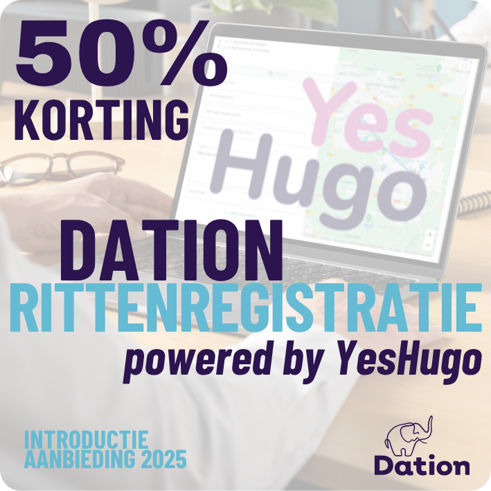 Speciaal voor jou als Dation klant ontvang je ook 50% korting op Dation rittenregistratie (powered by YesHugo). Dit jaar besteld, is voor altijd korting.
